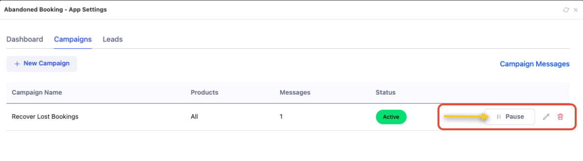 To pause a campaign, simply click Pause from the Campaigns tab. This will halt any messages from going out to new or existing leads.